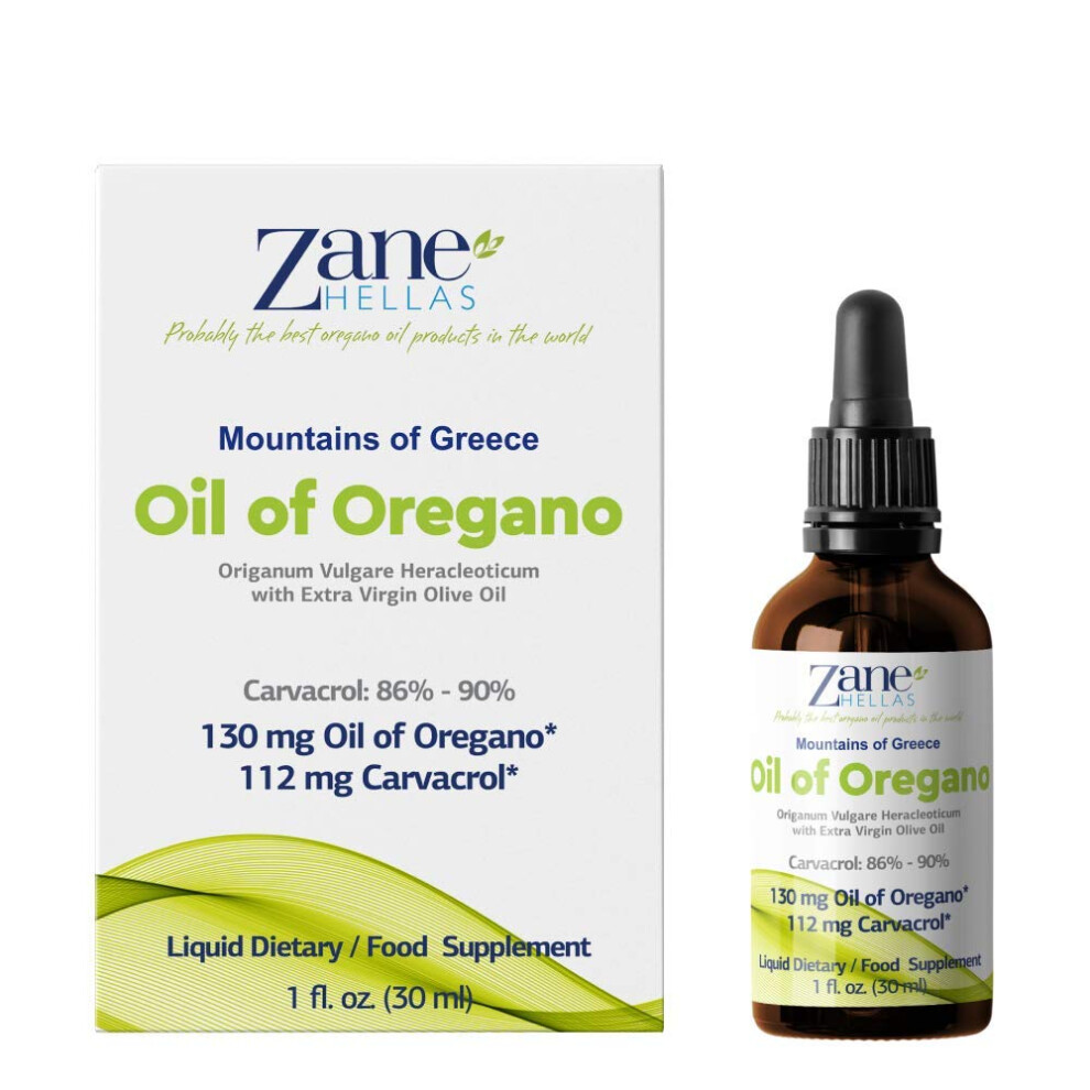 Zane Hellas 70% Oregano Oil. Pure Greek Essential Oil of Oregano .86% Min Carvacrol. 112mg Carvacrol Per Serving. Probably the Best Oregano Oil in The