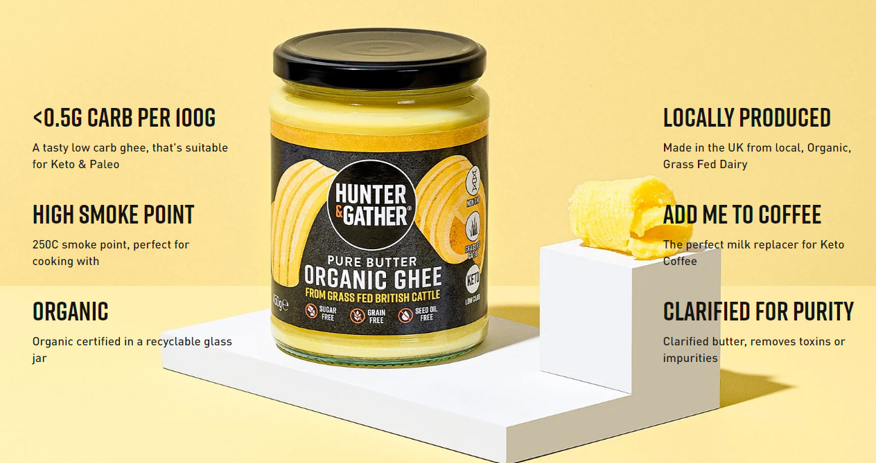 Hunter & Gather Certified Organic Ghee from Grass Fed British Cows 450g | Sugar, Gluten & Seed Oil Free & Low Lactose content | Keto, Low Carb & Paleo