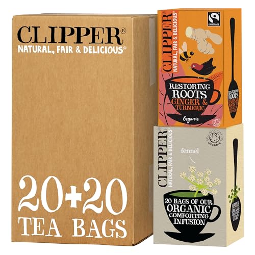 Clipper Tea Fairtrade Restoring Roots Ginger & Turmeric Organic 20 Tea Bags 36g & Organic Fennel Infusion Tea Bag, 40 g, 20 Count (Pack of 1)