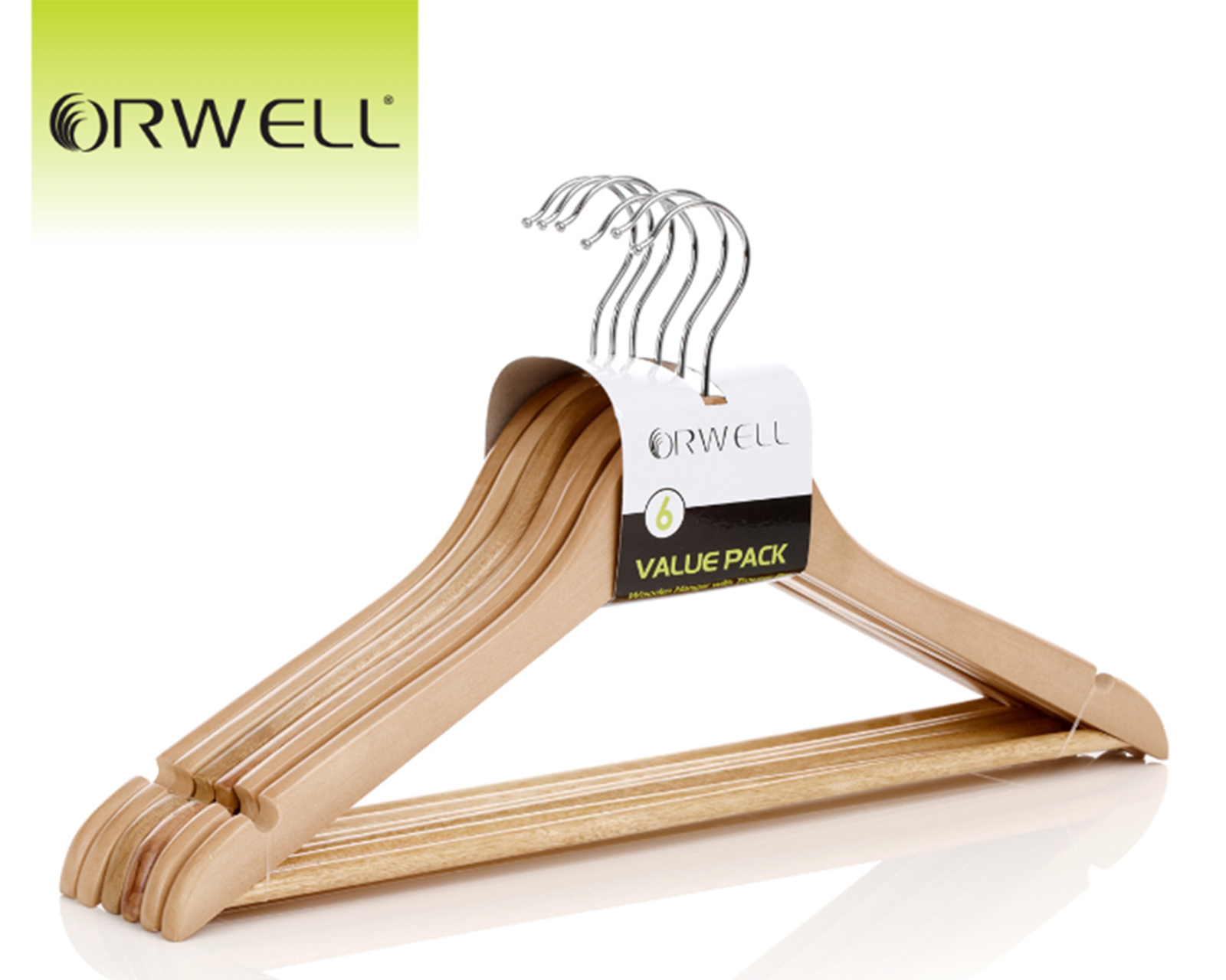 Orwell Premium Quality Wooden Flat Hanger with Trouser Bar 6pk