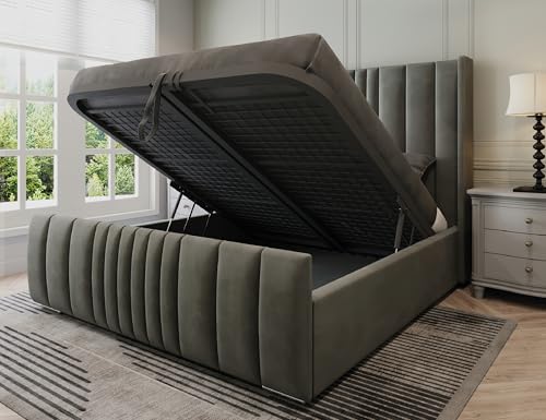 Furnishion Elysia Wingback King Size Bed Frame with Storage, Modern Velvet Ottoman King Size Beds with storage, Luxury Panelled Frame with Metal Mesh Base & 48" Headboard, Storage Bed in Grey Plush