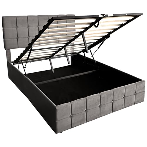 Adjustable Button-Tufted Headboard Storage Bed Frame, Velvet Ottoman with Hydraulic Storage, Double Bed with Soft Velvet Fabric, Sturdy Metal & Wood Support, No Mattress Included (Grey,Double)