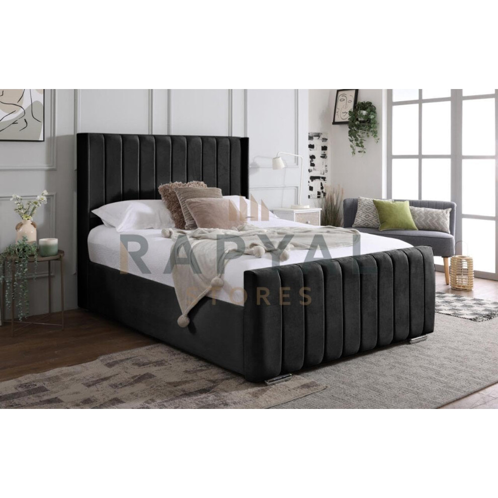 (4ft6, No Ottoman, With Mattress ) Ottoman Storage Bed Panel Black Plush Velvet Upholstered Bed Frame - Winged Vegas Headboard