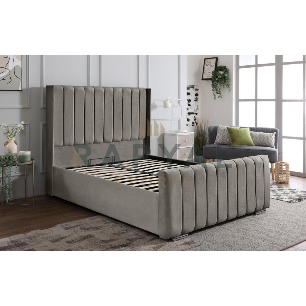 (4ft6, No Ottoman, With Mattress) OTTOMAN STORAGE BED PANEL STEEL PLUSH VELVET UPHOLSTERED BED FRAME- WINGED VEGAS HEADBOARD