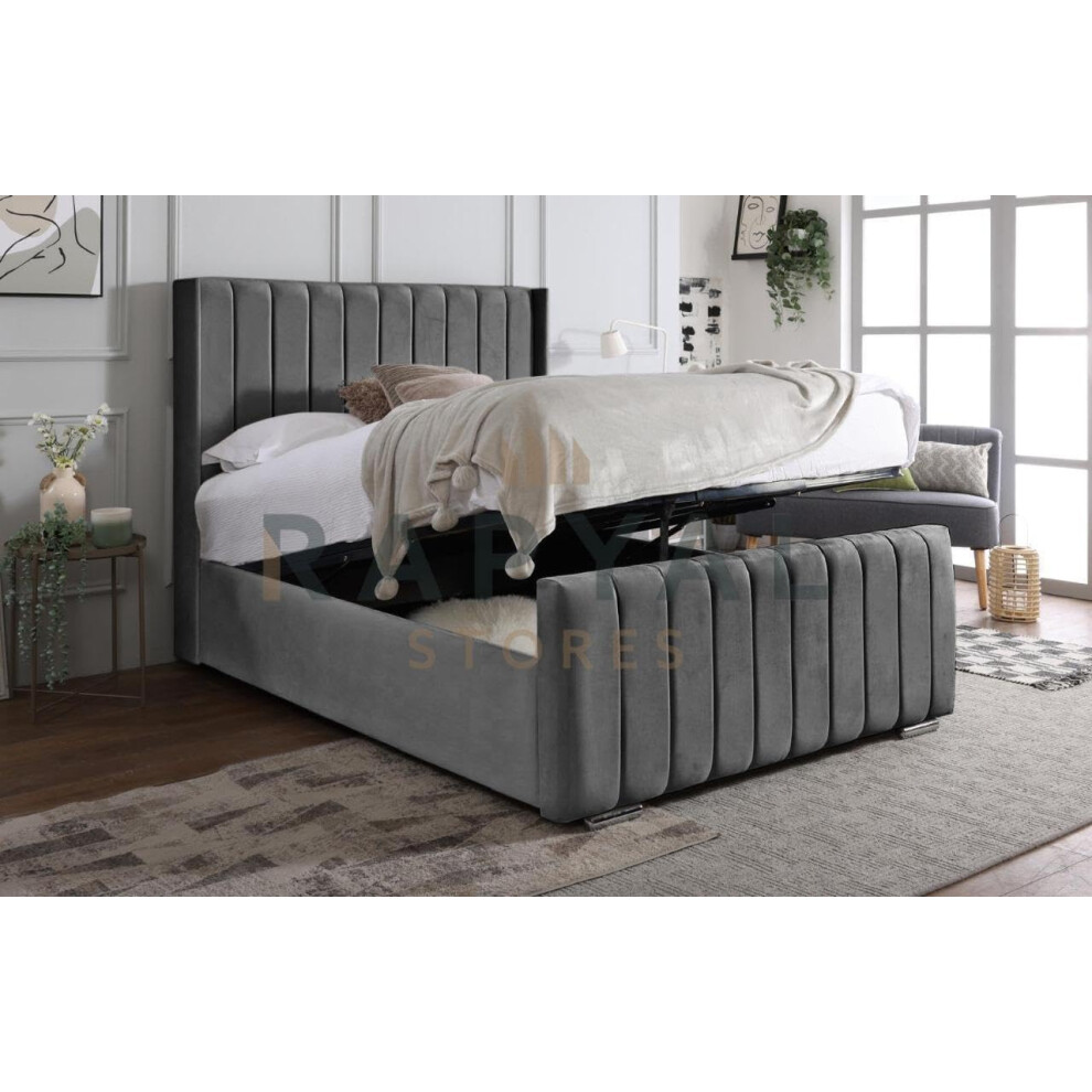(4ft6, With Ottoman, With Mattress) OTTOMAN STORAGE BED PANEL STEEL PLUSH VELVET UPHOLSTERED BED FRAME- WINGED VEGAS HEADBOARD