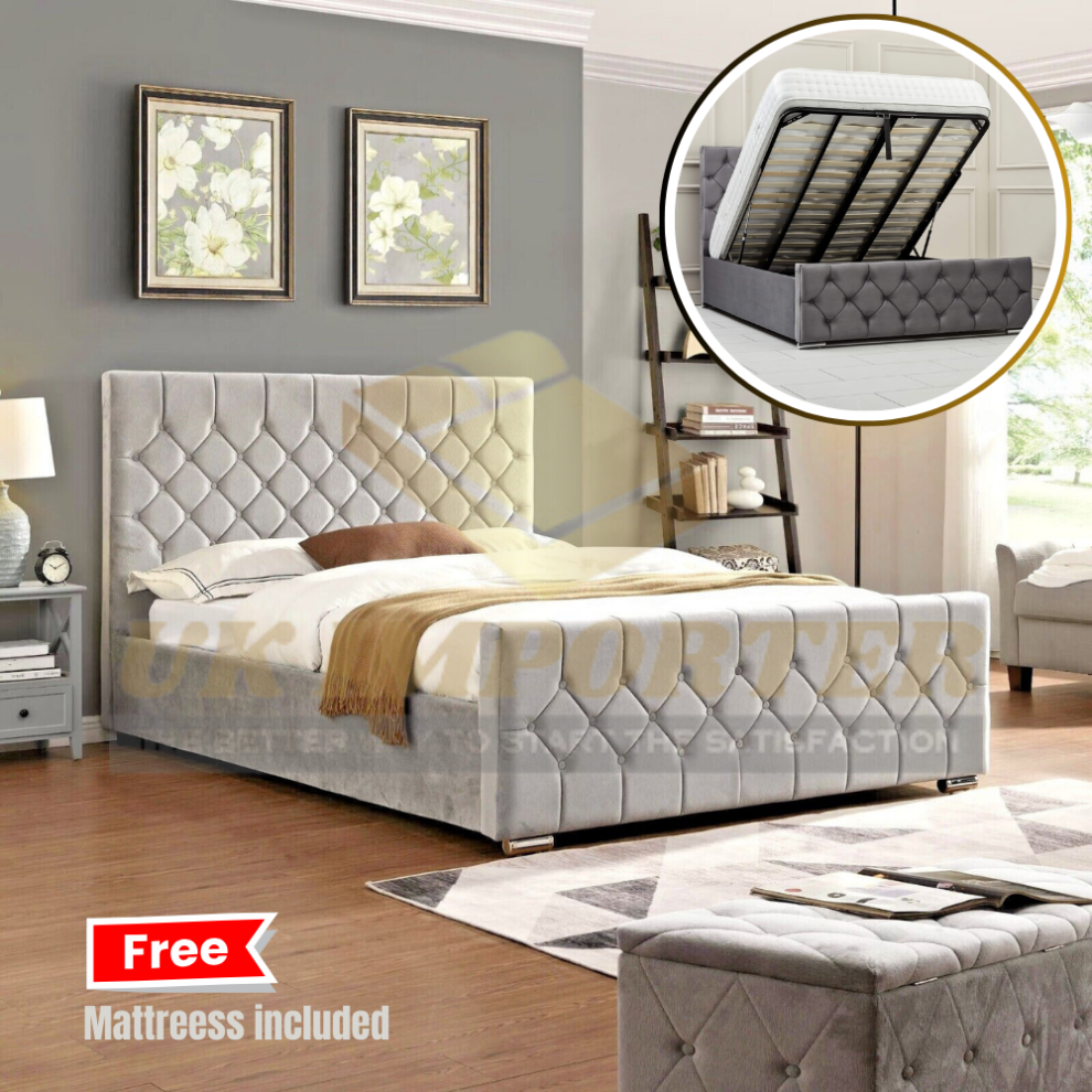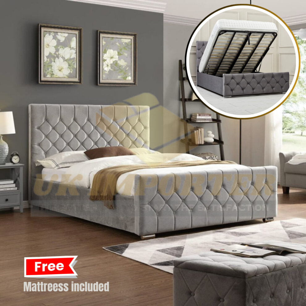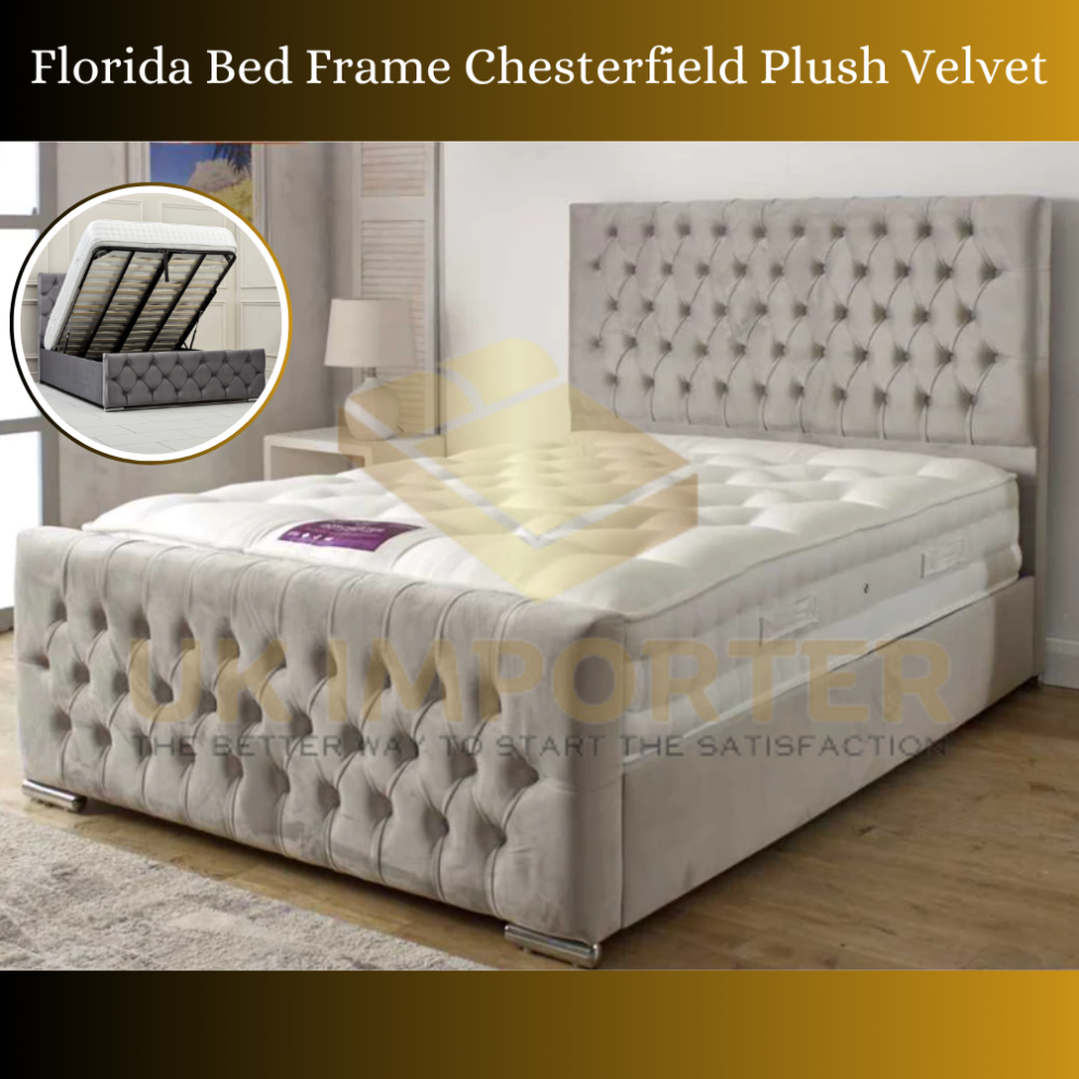 (Double 4ft6", Grey Plush(with Ottoman Storage)) Chesterfield Plush Velvet Florida Bed Frame with Mattress Ottoman Storage
