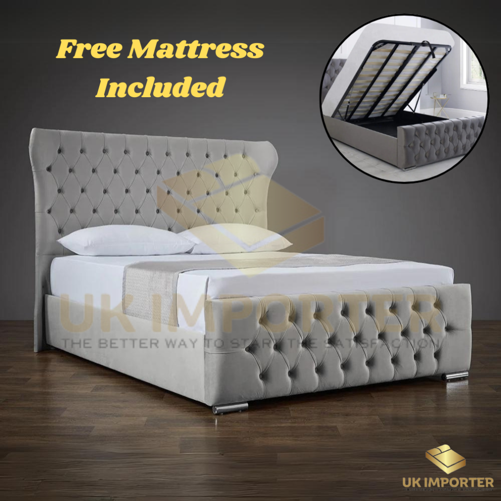 (Double - 4ft6", Grey Plush(with Ottoman Storage)) Oxford Chesterfield Winged Back Plush Velvet Bed Frame Ottoman GasLift Storage & Mattress