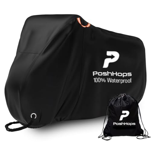 Poshhops Heavy duty Bike Cover for 1-2 Bikes, 600D Bike Covers for Outside Storage with Lock Holes, Bicycle Cover Waterproof Outdoor with Bike Storage Bag, Anti-UV, Windproof for Mountain & E-Bike