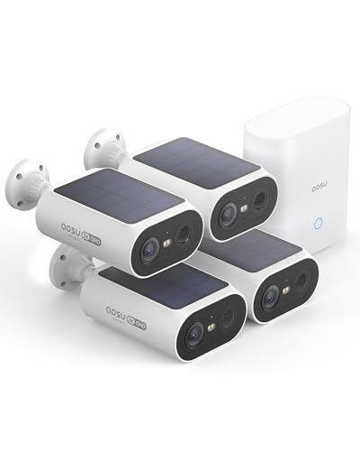 AOSU 2K Security Camera Outdoor Wireless, 4 Cam-Kit with Homebase, No Monthly Fee with Integrated Solar Panel, Forever Power, No Blind Spot Home Security, 32GB Local Recording [Energy Class A+++]
