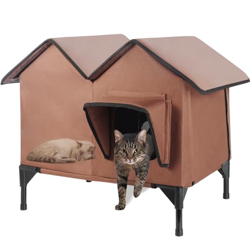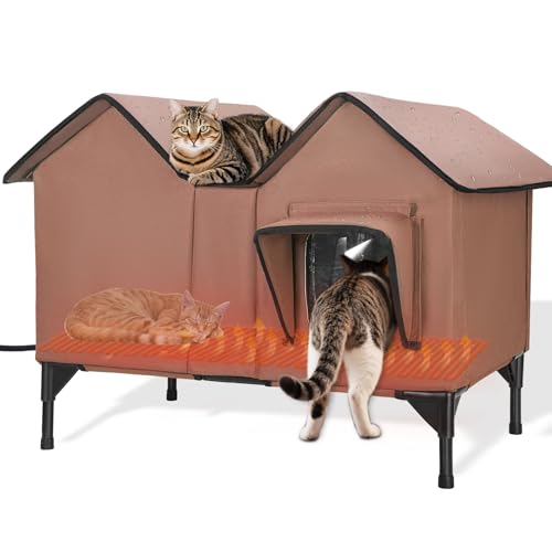 Heated Cat House, Widened and Enlarged Outdoor Cat House Waterproof with Two Escape Doors and Heating Pad, Elevated Insulated Winter House, Sturdy Outdoor Cat Shelter for Multiple Cats Dogs (Brown)