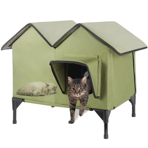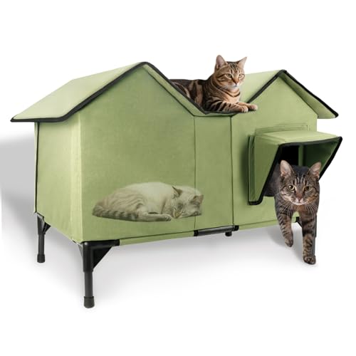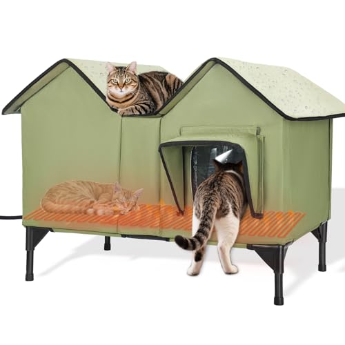 Heated Cat House, Widened and Enlarged Outdoor Cat House Waterproof with Two Escape Doors and Heating Pad, Elevated Insulated Winter House, Sturdy Outdoor Cat Shelter for Multiple Cats Dogs (Green)