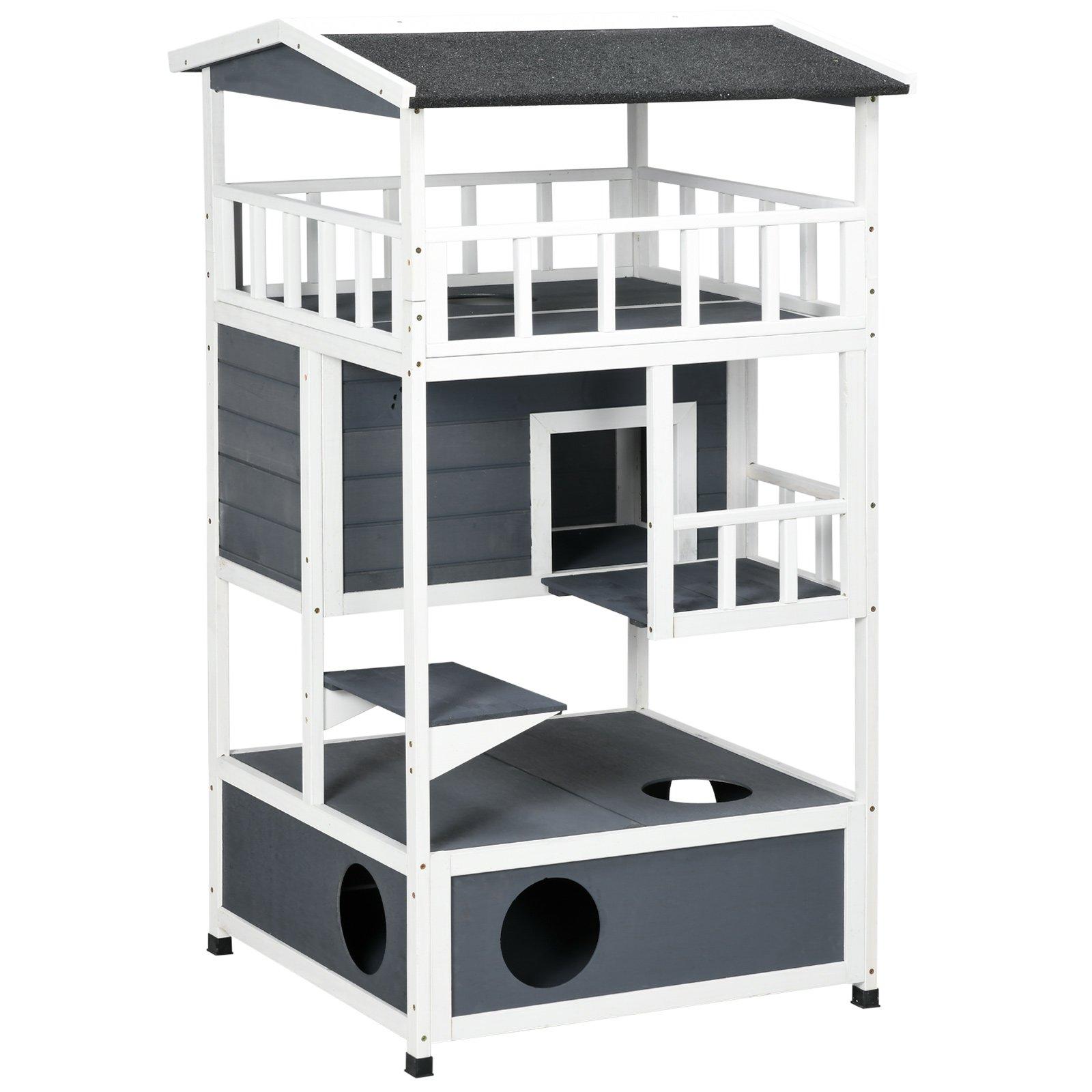 PawHut Wooden Outdoor Cat House 3-Tier Kitten Shelter w/ Tilted Roof Grey