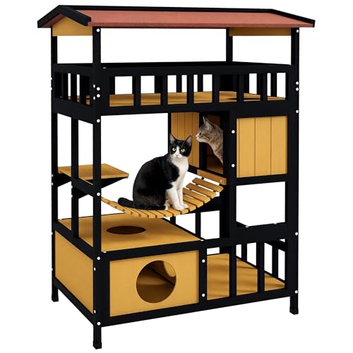 PawHut Wooden Outdoor Cat House 3-Tier Kitten Shelter w/ Tilted Roof Yellow