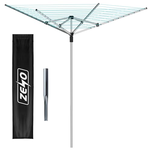 ZENO Outdoor Rotary Washing Line 45m | Easy Assembly 4 Arm Rotary Washing Line | Heavy Duty, Weather Proof, Powder Coated Finish Outdoor Clothes Dryer with Cover & Ground Spike | Silver