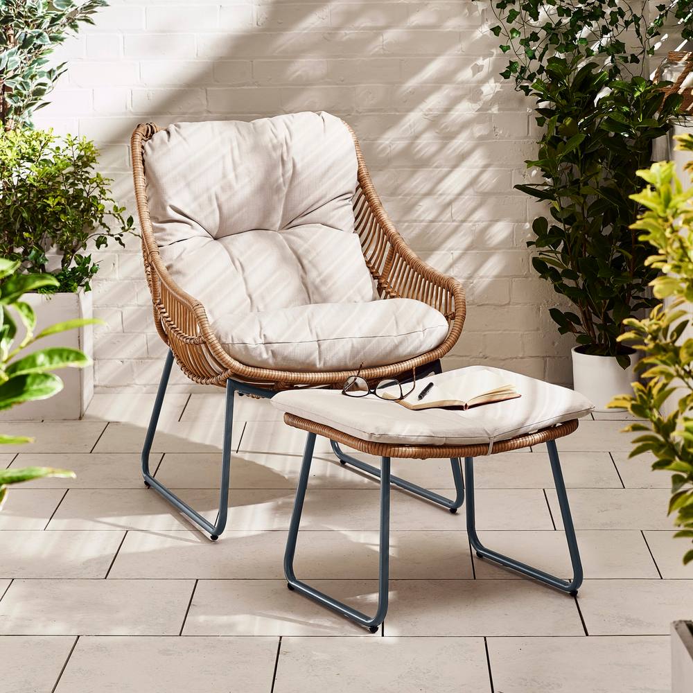 Tahiti Large Outdoor PE Rattan Chair & Footstool Set with Light Grey Cushions For The Boho Garden Or Patio Space