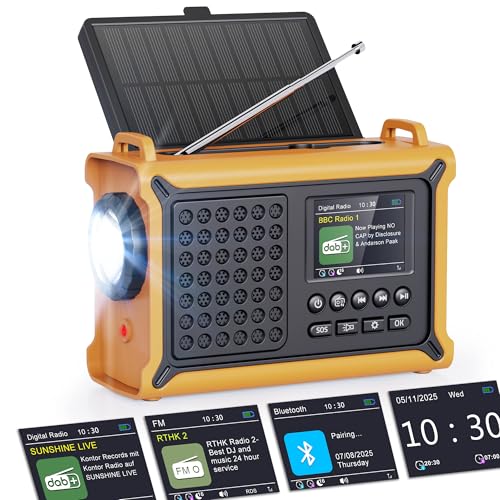 Portable DAB/FM Radio with 5000mAh Rechargeable Battery, Hand Crank Solar Outdoor Digital DAB+ Radio with USB Charger, Emergency SOS Alarm, Headphone Jack, Alarm Clock, Flashlight & Reading Light