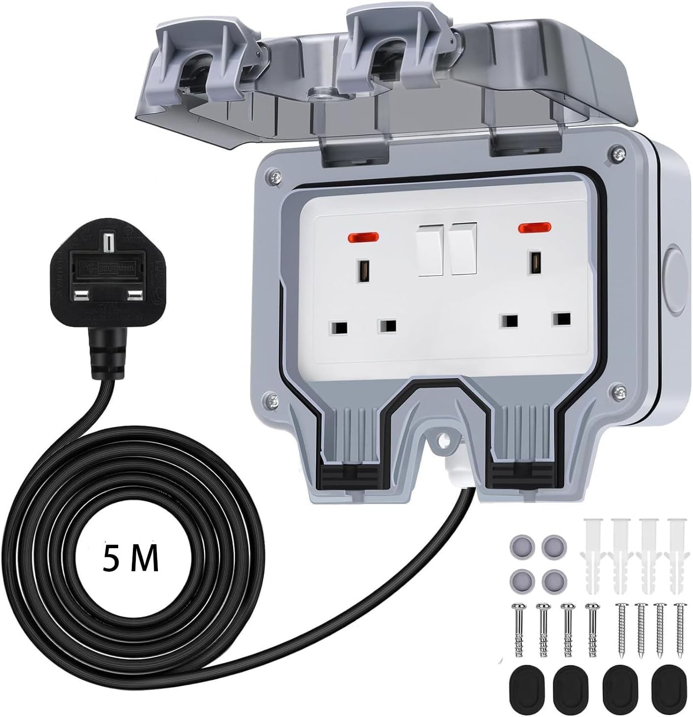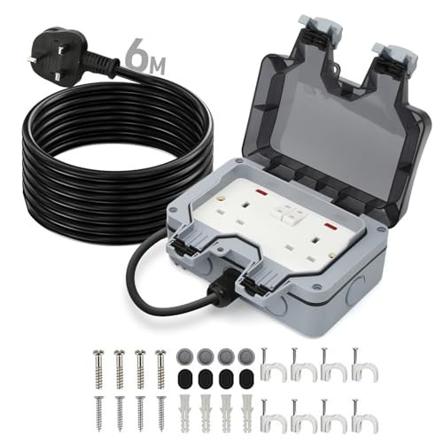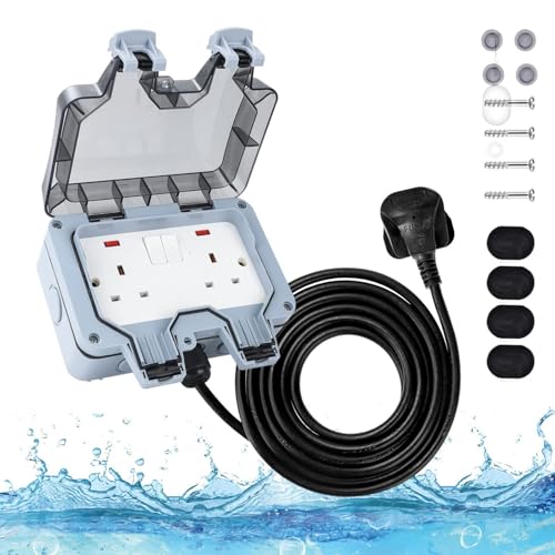 5M Outdoor Socket 2 Gang Waterproof Outdoor Double Socket with Extension Lead Switched Sockets Garden Power Socket External Mains Outlets IP66 Weatherproof (5M)