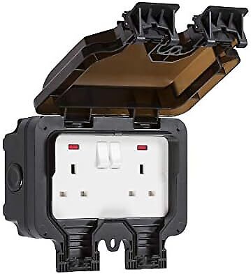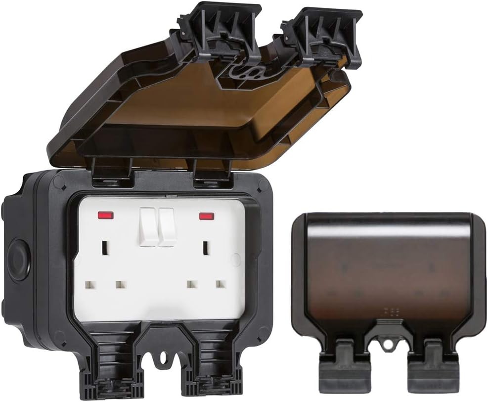 Double Outdoor Socket Waterproof Outside Plug Socket Weatherproof IP66 Wall Electrical Outlet 13Amp 2Gang Storm Switched Power Socket