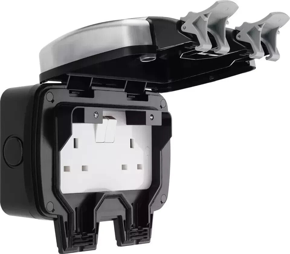 Black Outdoor Double Switch Socket Waterproof IP66 IK06 Lockable Garden Outside