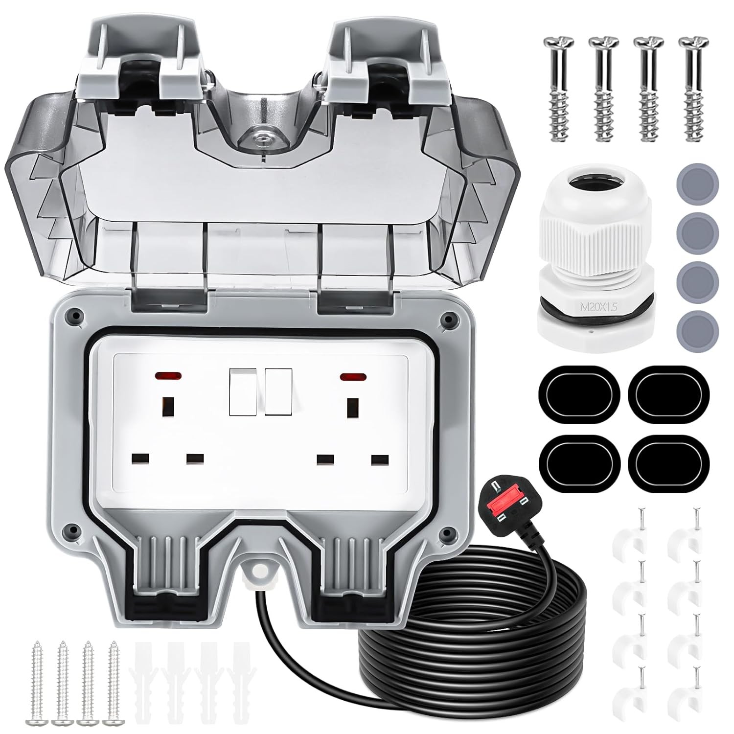 Weatherproof Outdoor Socket Waterproof Double Socket 3M Extension Lead IP66 Switched Wall Electrical Outlet 13 Amp 2 Gang Power Socket, Garden Outside Plug Sockets Cover Box