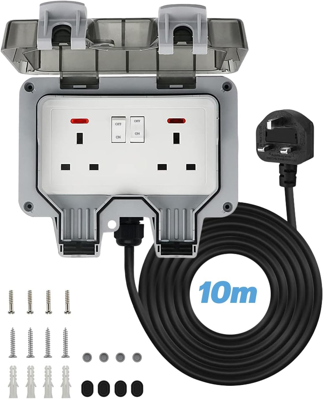 Outdoor Socket with 10m Extension Lead, Outdoor Double Socket Waterproof IP66,