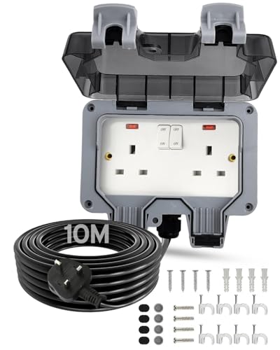 Waterproof Outdoor Sockets with 10 meters Extension Cord, Weatherproof Outdoor Double Plug Sockets, Exterior Wall Garden 2 Gang Storm Switched Socket Outside Power Socket