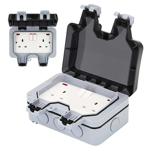 Outdoor Socket Waterproof IP66 Outside Double Plug Socket Weatherproof Wall Electrical Outlet 13Amp 2 Gang Storm Switched Power Box External Plug Extension with Lockable Cover