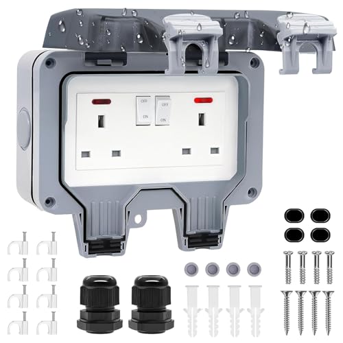 Weatherproof Outdoor Sockets, Double Waterproof Switched Power Socket IP66, Wall Electrical Outlets with Cover, 13A Plug Sockets, for Garden & External Electrical Outlet, Grey (grey)