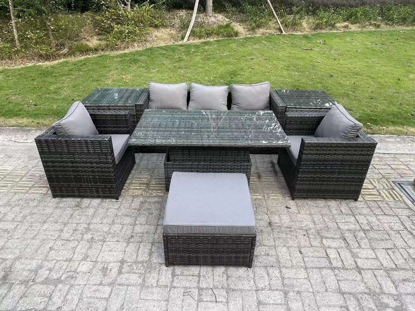 6 Seater Rattan Garden Furniture Sofa Set Outdoor Adjustable Rising Lifting Dining Table Set 2 Armchairs