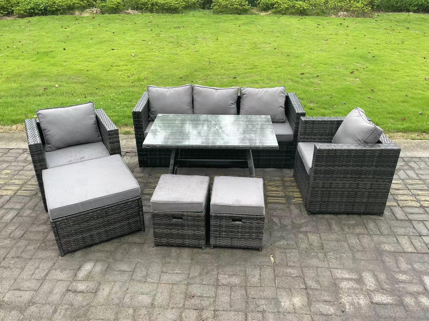 Rattan Garden Outdoor Furniture Sofa Garden Dining Set with Patio Dining Table 2 Armchairs Small Footstools
