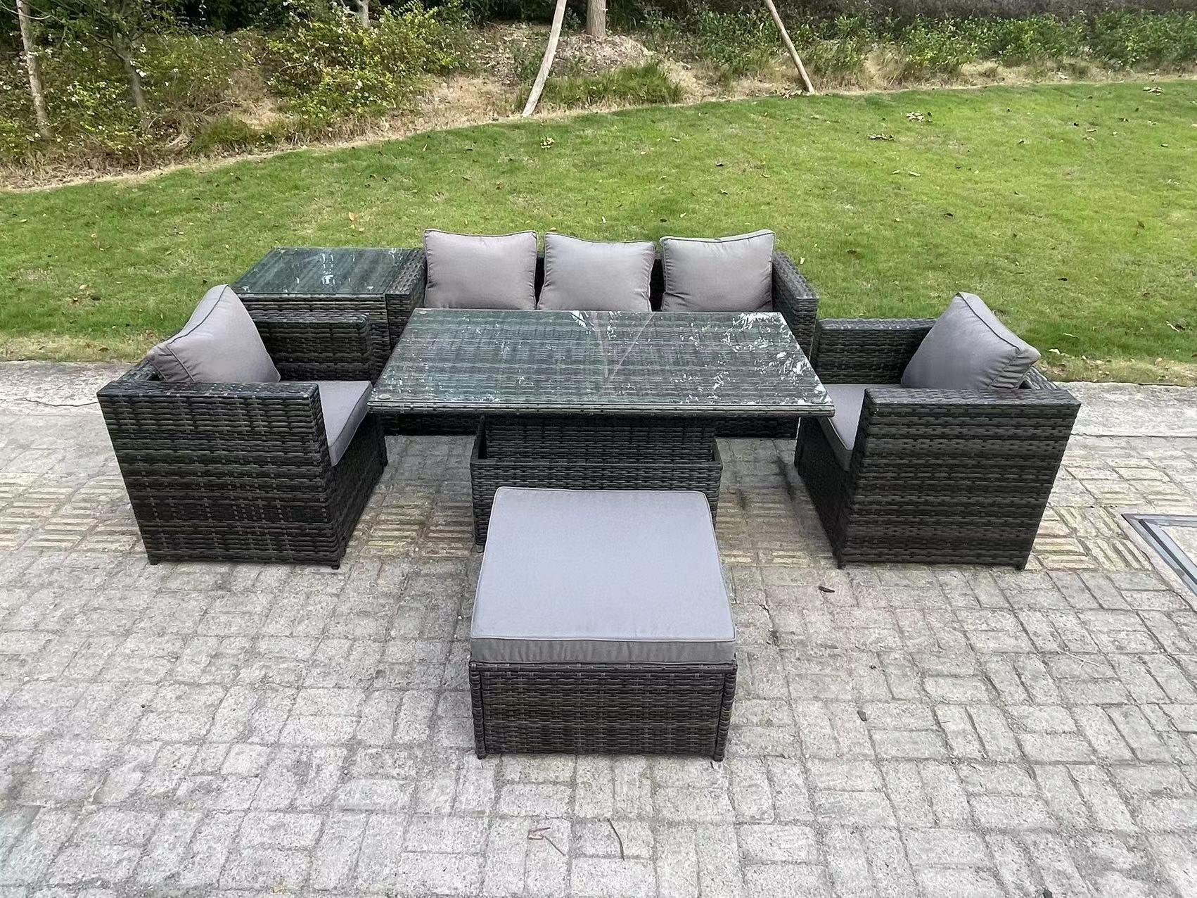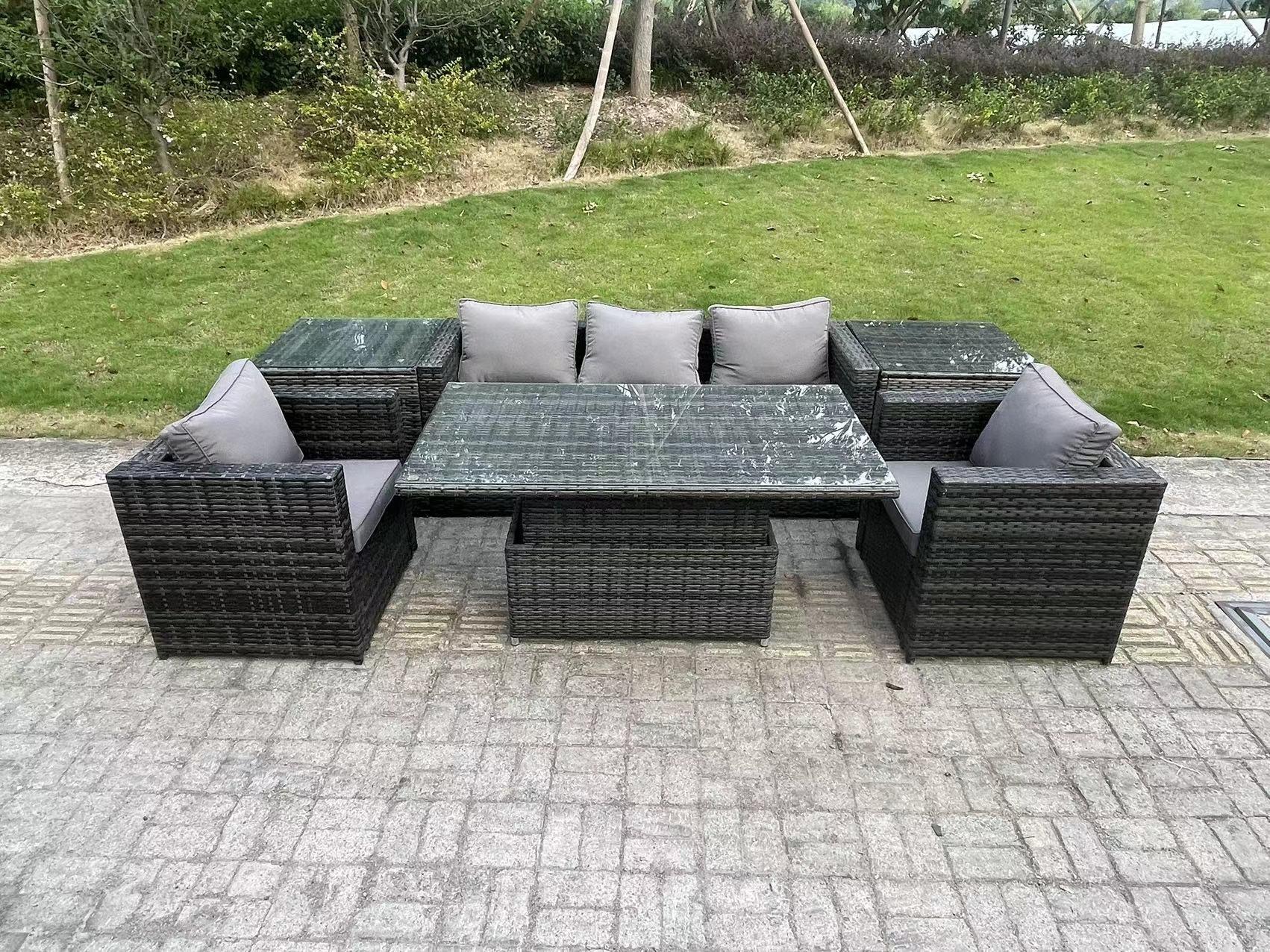Rattan Outdoor Furniture Sofa Garden Dining Set with Patio Dining Table 2 Armchairs Side Table 8 Seater