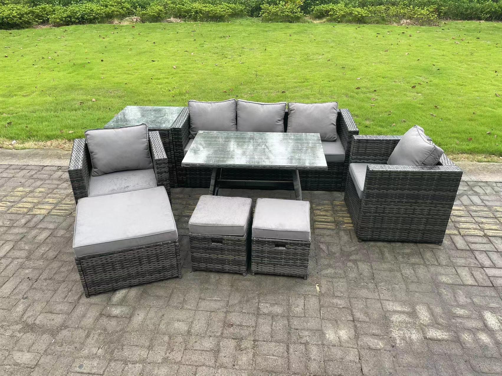 Outdoor Rattan Garden Furniture Sofa Set Adjustable Rising Lifting Dining Table Set Side Table 2 Armchairs