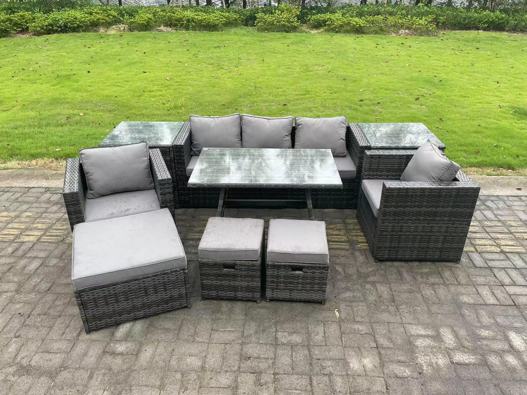 High Back Outdoor Garden Furniture Set Rattan Corner Sofa Dining Table Set With 2 Armchairs 8 Seater