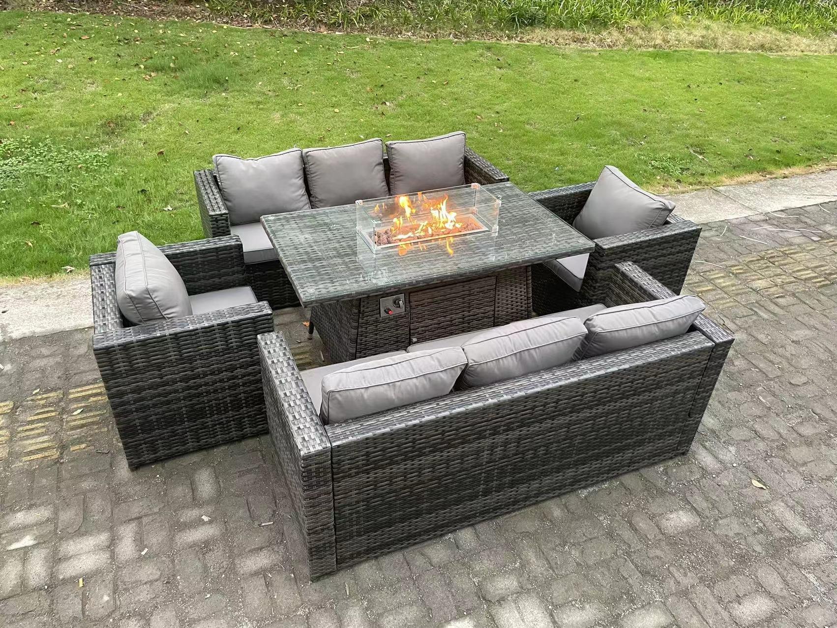 Rattan Outdoor Furniture Gas Fire Pit Rectangle Dining Table Gas Heater Chairs Love Sofa 6 Seater