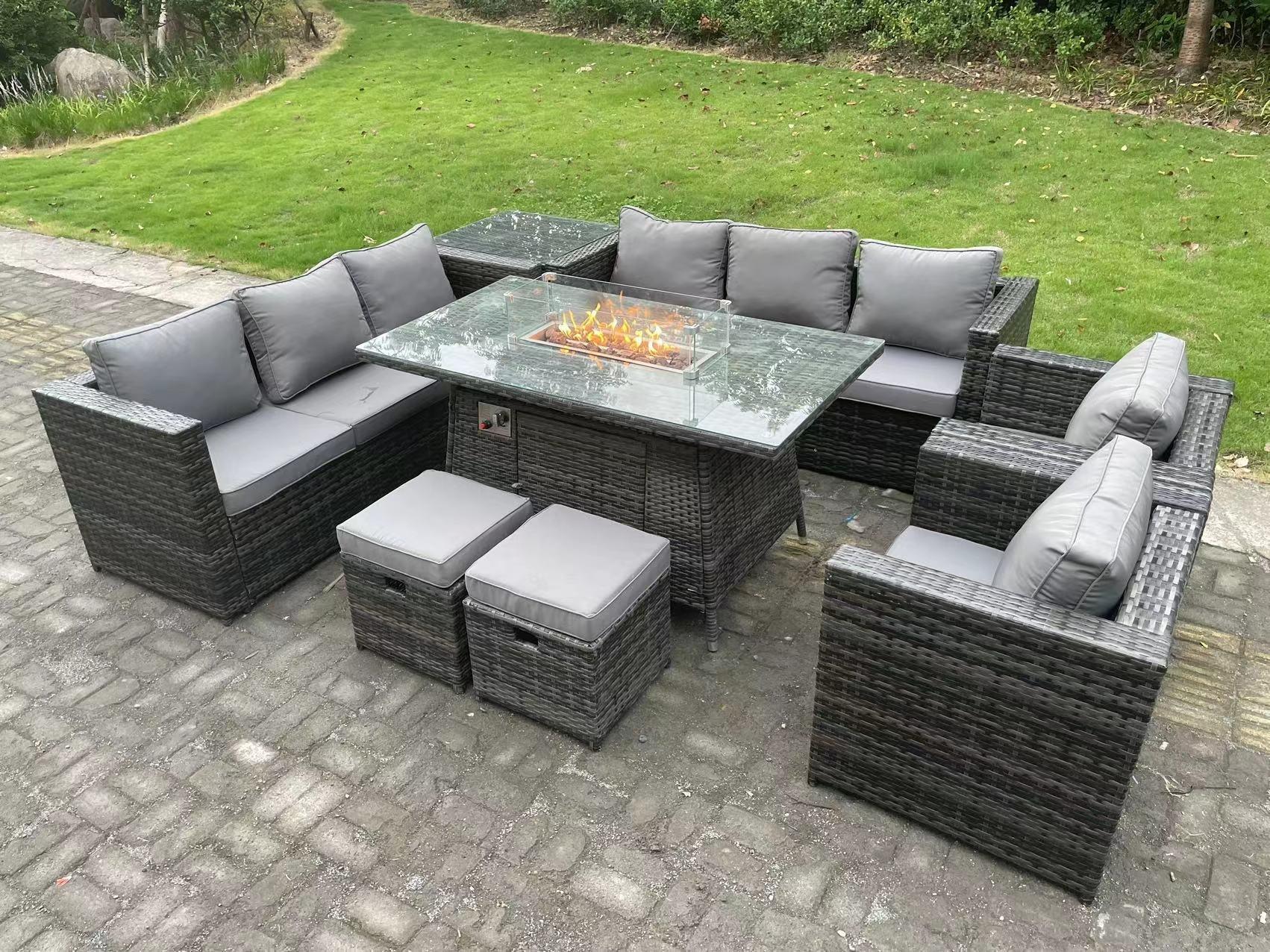 FMSGarden 8 Seater Rattan Garden Furniture Sofa Set Outdoor Patio Gas Fire Pit Dining Table Gas Heater Burner With 2 Armchairs Dark Grey Mixed