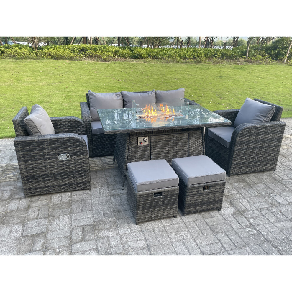 Fimous Rattan Outdoor Furniture Gas Fire Pit Rectangle Dining Table Footstools 8 Seater