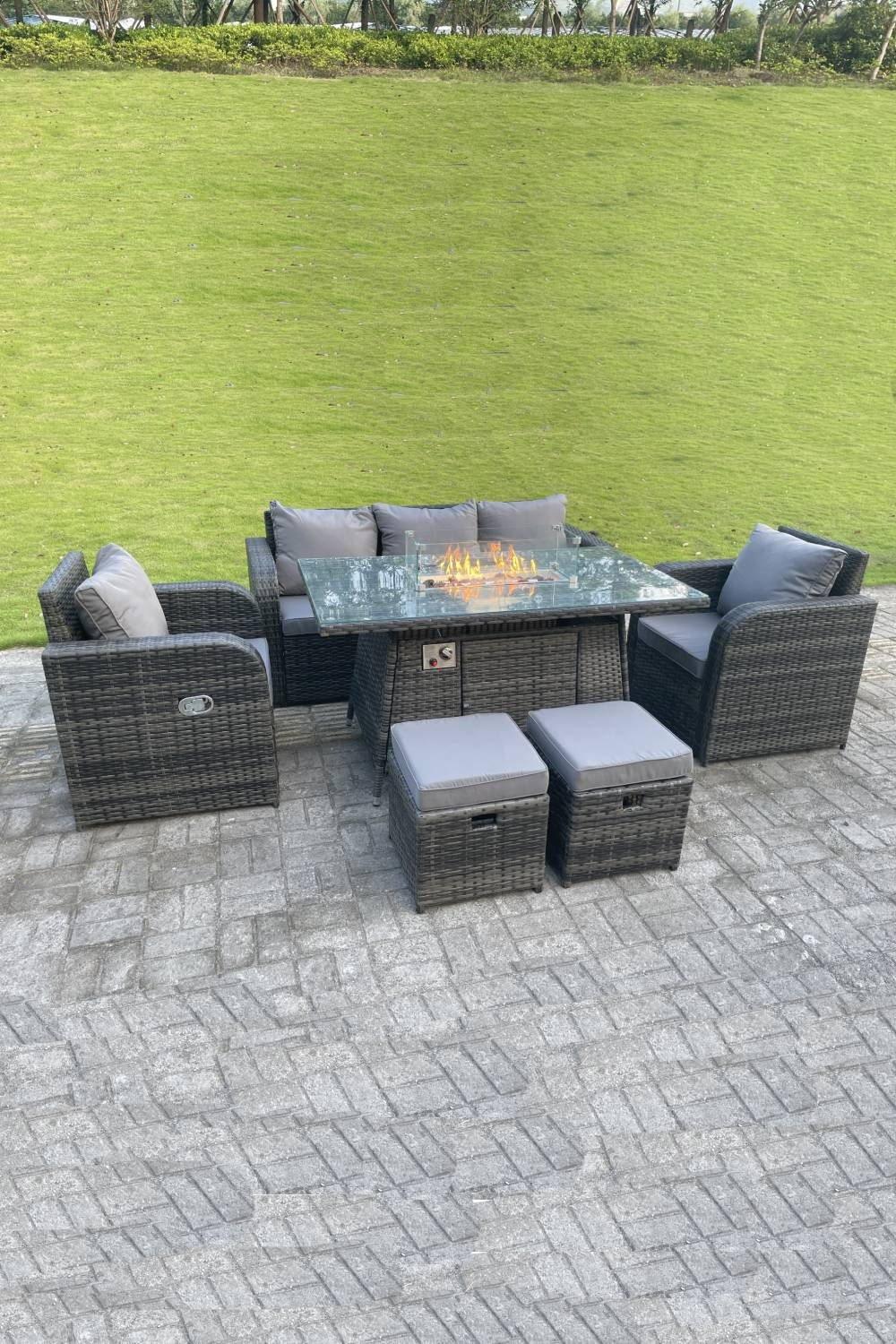 FMSGarden Rattan Garden Furniture Sofa Set Outdoor Patio Gas Fire Pit Dining Table Gas Heater Burner With Armchair 2 Small Stools 9 Seater Dark Grey Mixed