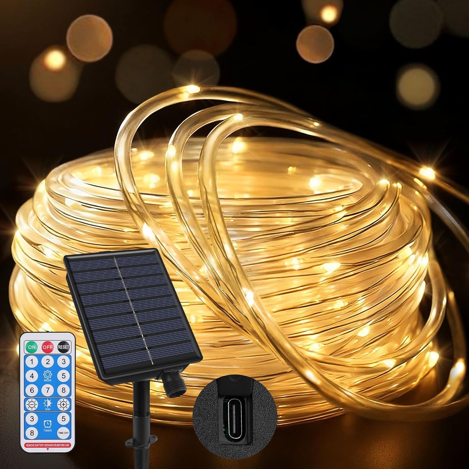 Outdoor Rope Lights 98.4ft/30m 300 LEDs, Dual Solar & Type-C Charging, 8 Lighti