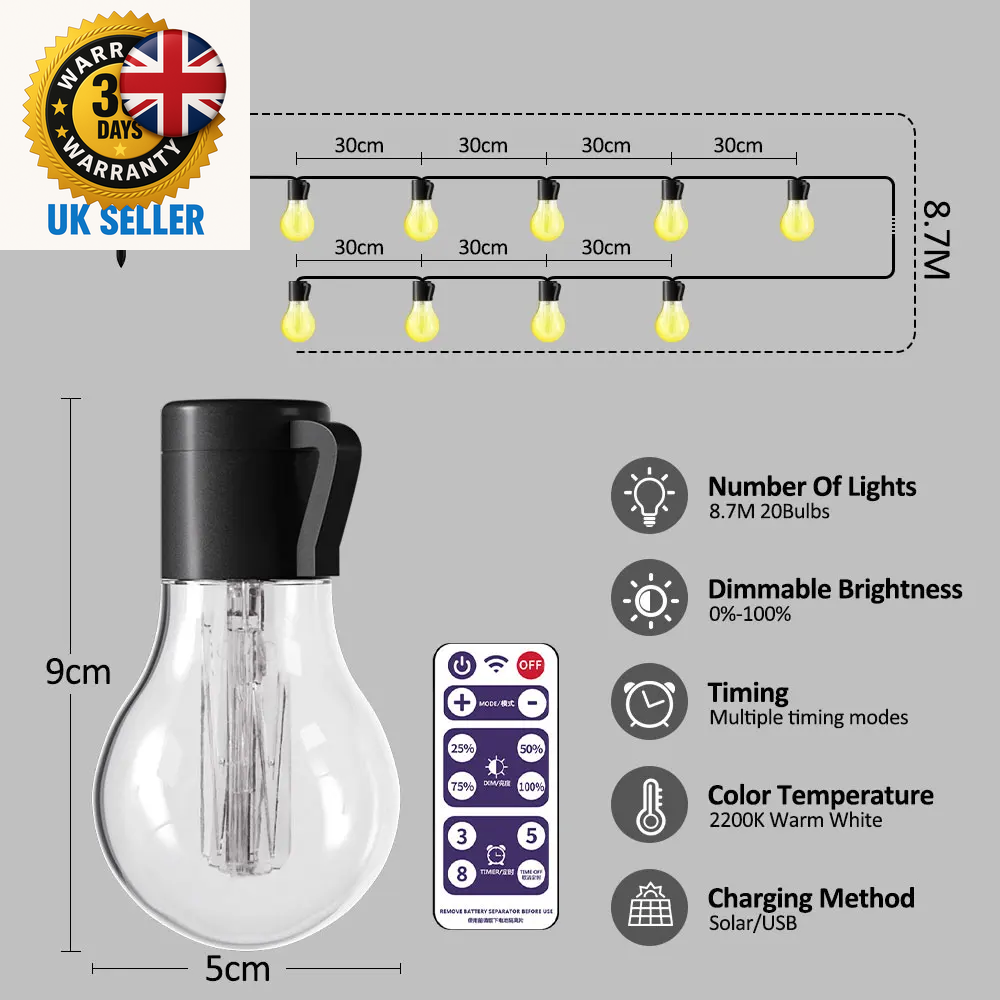 11.7M/8.9M Outdoor Solar String Lights with IP65 Shatterproof LED Bulbs and Remo