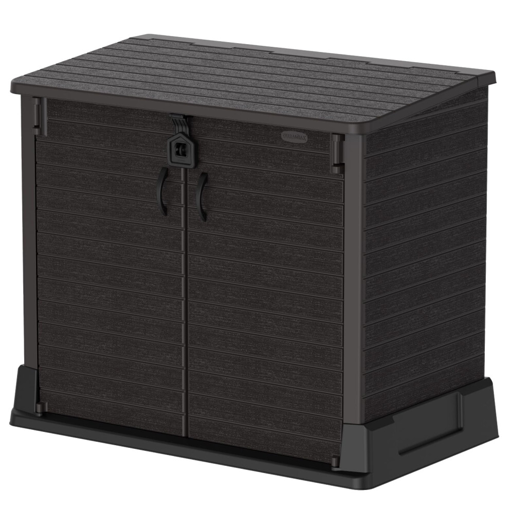 Duramax Cedargrain StoreAway 850L Plastic Garden Storage Shed - Outdoor Storage Shed, Wheelie bin box, Durable Construction, Ideal for Tools, BBQs & 2x 120L Garbage Bins, 130x74x110 cm, Dark Grey