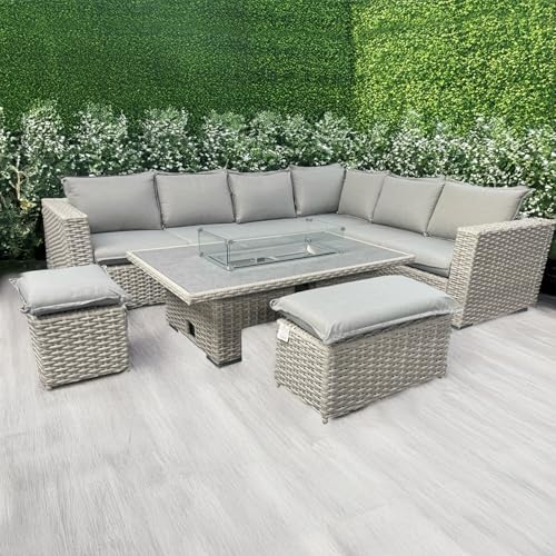 Furnishings For Less UK L Shaped 9 Seater Grey Rattan Patio Set With Fire Pit Table Outdoor Seating (Yes - Rain Cover)