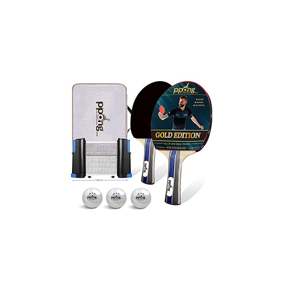 PPong co uk Table Tennis Set All-in-One Kit with Retractable Ping Pong Net for Any Table, Bats, Premium 3-Star Ping Pong Balls & Luxury Storage C