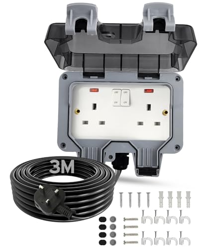 Weatherproof Outdoor Socket Waterproof Double Socket 3M Extension Lead IP66 Switched Wall Electrical Outlet 13 Amp 2 Gang Power Socket, Garden Outside Plug Sockets Cover Box