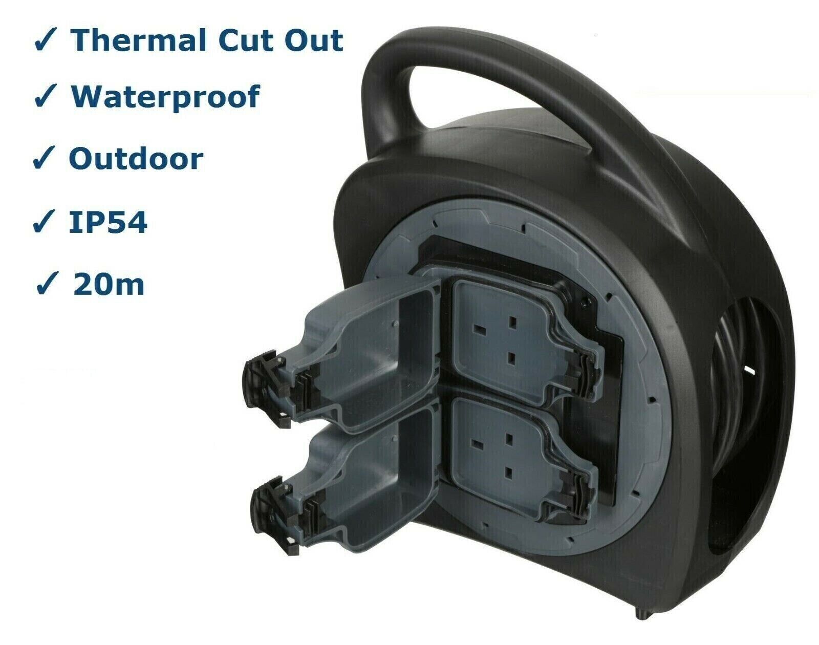 Waterproof Extension Lead 20m Cable Reel Outdoor Garden 2 Socket Gang 240V 13A
