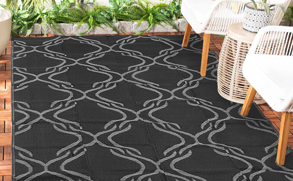 COZYLOOM Plastic Straw Rug 9x12 Outdoor Patio Rugs Large Reversible Plastic Camping Rugs Waterproof Modern Floor Mat for Backyard Porch RV Pool Deck Picnic Beach Trailer Black White Panel