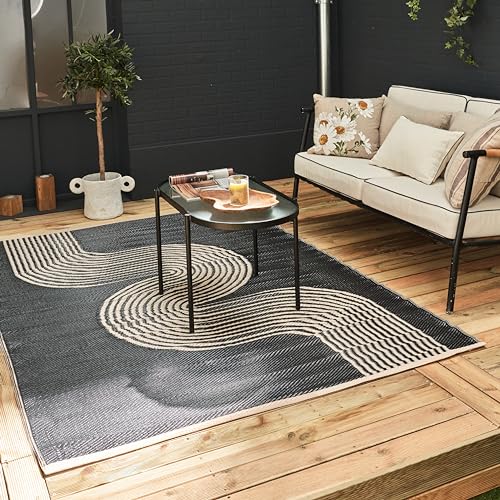 THE RUGS Urban Collection Outdoor Rug - Easy to Clean, Reversible, Waterproof Plastic Outdoor Rugs for Garden, Patio, Balcony, Camping - Contemporary Plastic Straw Rug - Waves Black/Beige, 150x220cm