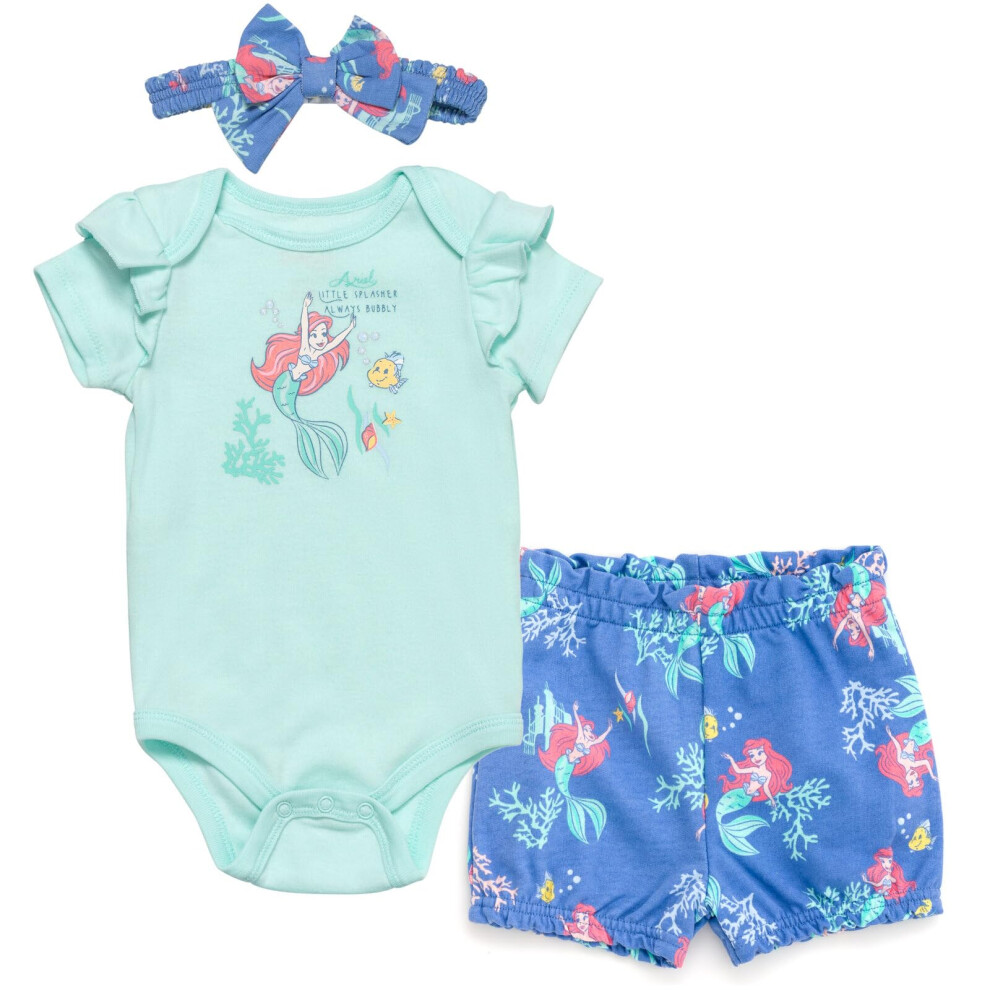 Disney Princess Ariel Newborn Baby Girls Bodysuit French Terry Bubble Shorts and Headband 3 Piece Outfit Set Blue 6-9 Months