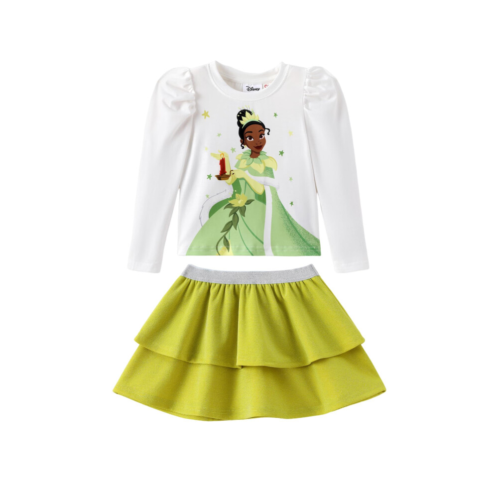 Disney Princess Tiana Toddler Girl 2 Piece Outfit Puff Long Sleeve Top & Green Sparkly Skirt Set Birthday Party Dress Fall Winter Clothes 2T