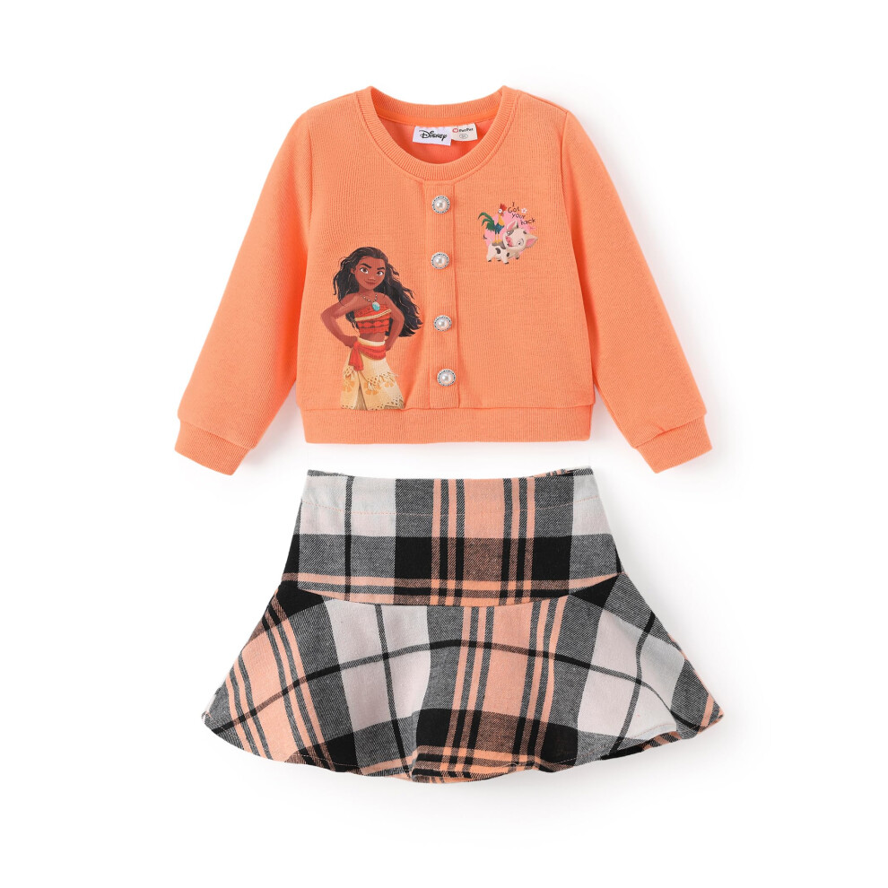Disney Princess Moana Toddler Girl 2 Piece Outfit Orange Long Sleeve Pearl Button Knit Top & Plaid Tweed Skirt Set Birthday Elegant Dress 3T