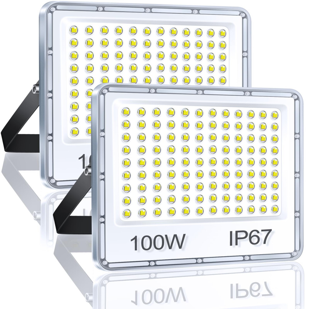 YIQIBRO 100W LED Floodlight 2 Pack, 10000LM LED Flood Lights Outdoor, 7000K Daylight Outside Security Lights, IP67 Waterproof LED Spotlight Wall Light